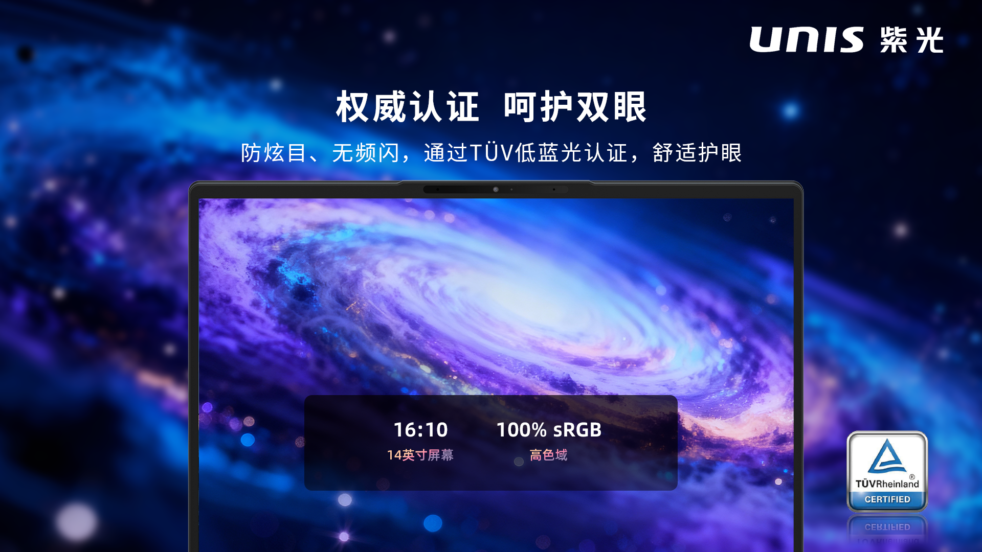 在显示效果上,UNIS L3813 G3配备了高分辨率14英寸16:10比例LCD屏,支持100% sRGB色域覆盖,色彩还原准确;屏幕通过TÜV低蓝光认证,有效减少蓝光对眼睛的伤害,保障用户长时间使用下的舒适与健康。