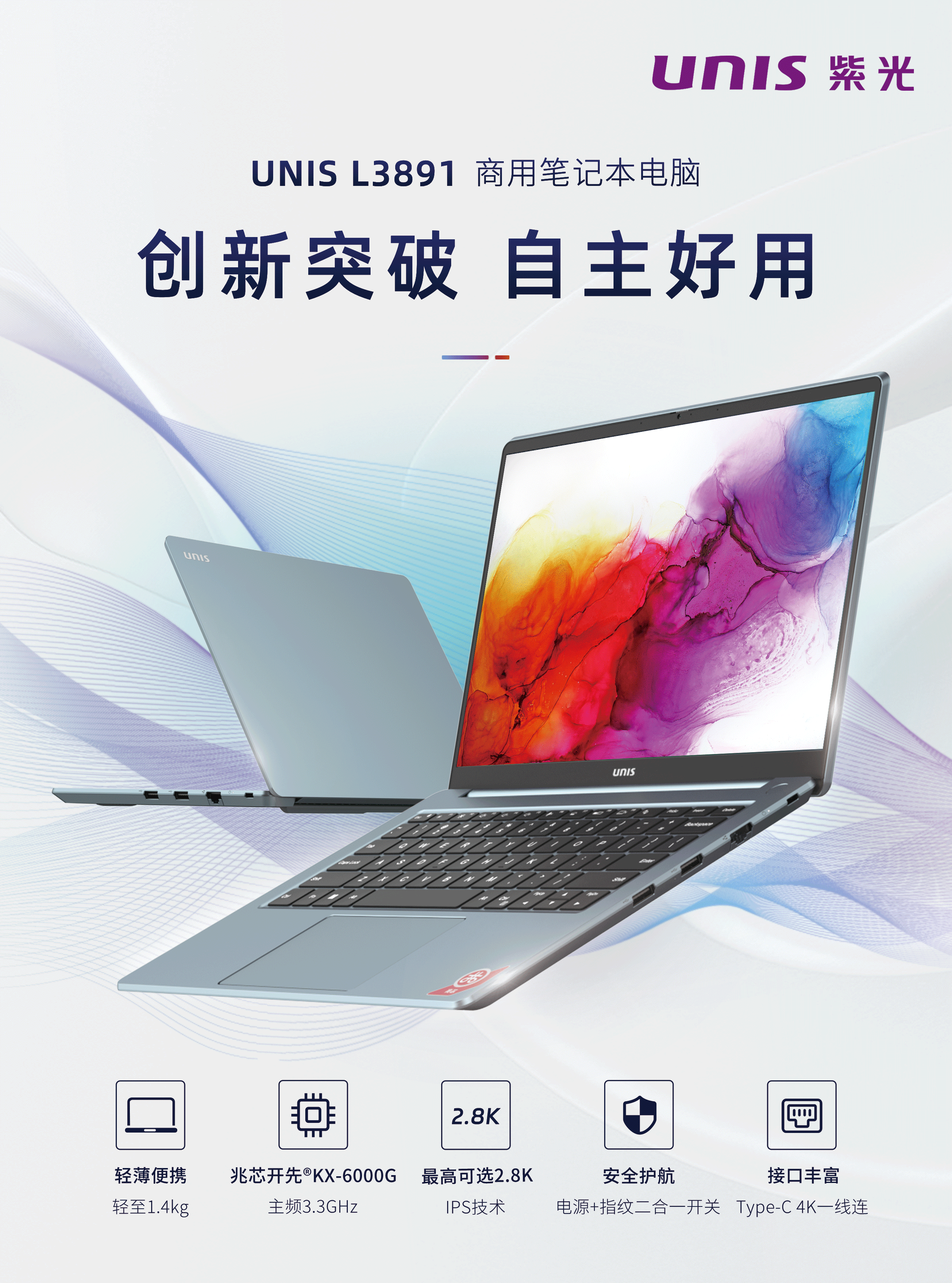 UNIS L3891 G3商用笔记本电脑搭载兆芯开先®KX-6000G处理器,主频3.3GHz;CPU集成C-1080 图形核心,支持4K输出显示;主板具备2个SO-DIMM内存插槽,最大标配32GB DDR4-3200内存。该机型扩展接口丰富,Type-C接口支持4K一线连,支持双接口充电及65W PD快充,适合更多办公场景应用。具备一块14英寸IPS屏幕,100%sRGB高色域让色彩更加鲜艳真实。此外,电源+指纹二合一开关、机身安全锁孔及TCM2.0可信密码模块等配置,给用户带来更好的安全防护体验。